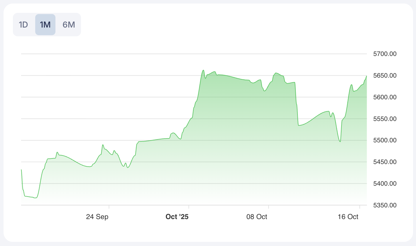 The IBEX 35 (^IBEX) is quoted at 15622.2, holding just below annual highs and up 0.33333, with the banking sector providing leadership. The Euro STOXX 50 (^STOXX50E) is at 5648.99, up 0.7843, and continues to exhibit a strong long-term bullish trend, indicating sustained institutional inflows into European blue-chip equities. Short-term signals are strong long for both the FTSE MIB Index and Euro STOXX 50, while other indices show flat or cautiously positive momentum.