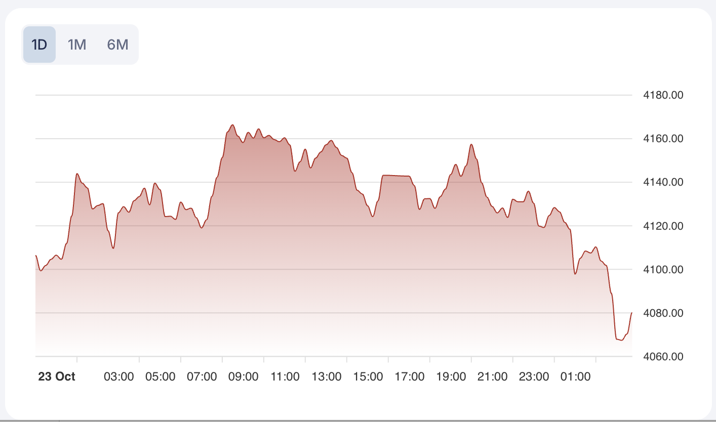 Gold has surged to a record high, currently trading at 4064.04 per ounce. Prices stand well above the 50-day 3814.2595 and 200-day 3399.71297 moving averages, reflecting robust technical momentum. The RSI is near 70, signaling an overbought market, yet the prevailing strong long trend suggests bullish continuation in the short term.