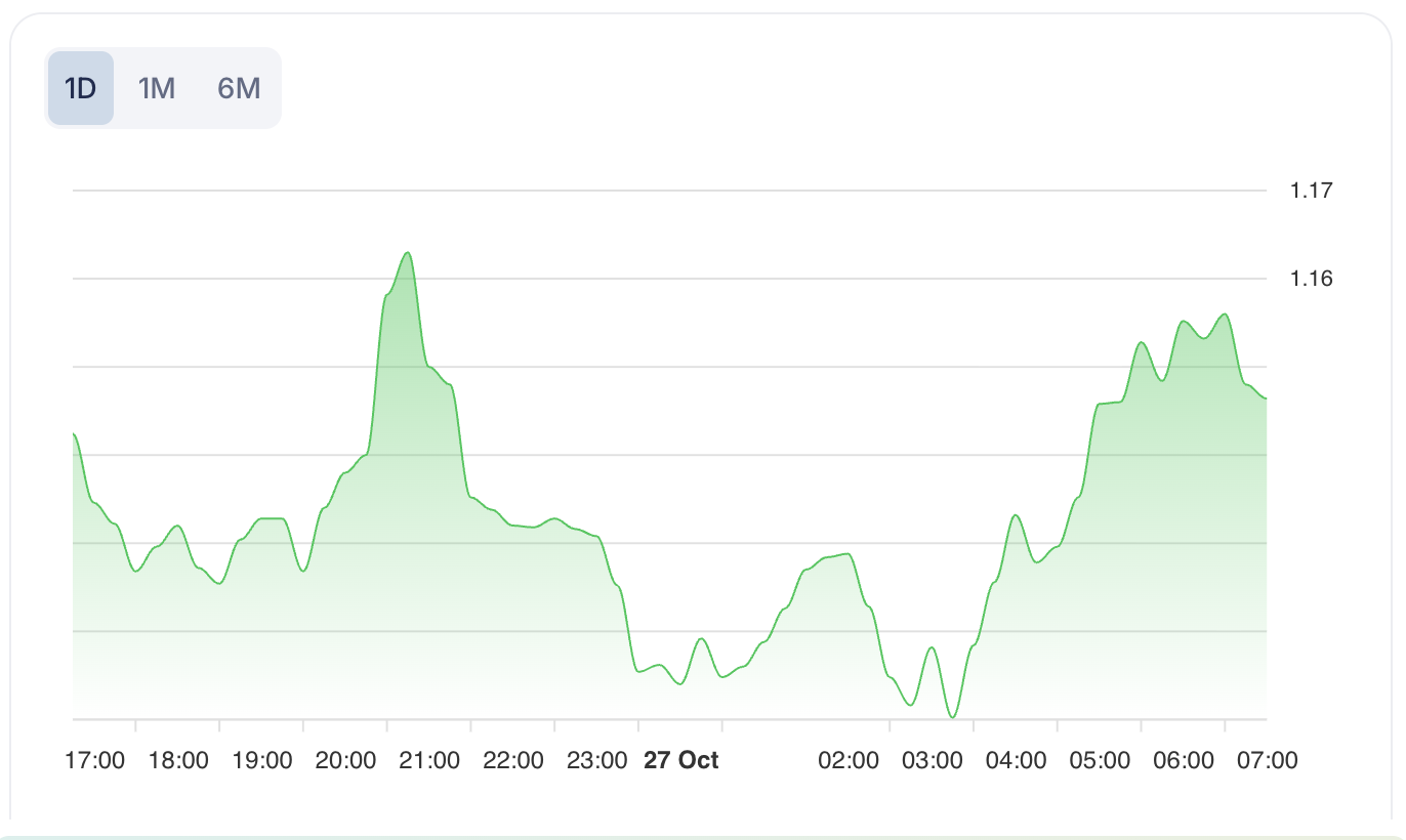 EUR/USD is quoted at 1.16402, just below its 50-day average of 1.16952, indicating mild downward momentum. Key support sits at 1.1580 and 1.1599, with resistance at 1.1700 and 1.1750. The breakout range is 1.1580–1.1700. The pair shows a “STRONG_LONG” micro-trend, suggesting temporary bullish momentum, but the broader trend is consolidative.