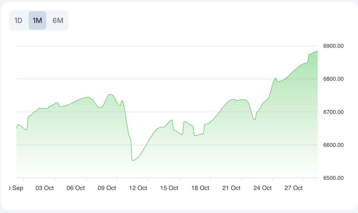 The major U.S. indices are exhibiting notable strength as they trade near or at all-time highs. The S&P 500 (^GSPC) is currently quoted at 6883.72, registering a slight gain of 0.12451. The index reached a new annual high of 6897.74, reflecting persistent bullish momentum. The Dow Jones Industrial Average (^DJI) stands at 47730.34, up by 0.39069, while the index also marked a new yearly peak at 47905.95. The NASDAQ Composite (^IXIC) is trading at 23743.498, representing an advance of 0.44862, and also reached a fresh annual high of 23783.68.
