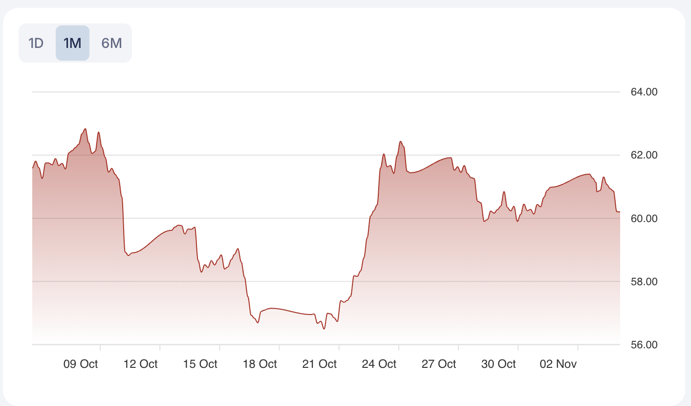 WTI crude oil is currently trading at 60.07 per barrel, hovering near five-month lows and testing critical support at the 59.70 mark. The price remains below both its 50-day and 200-day moving averages—61.7612 and 64.18565—confirming a prevailing bearish technical structure. The Relative Strength Index (RSI) is in the 28–34 range, indicating oversold conditions and the potential for a technical rebound if support holds. However, the micro-trend is flat, reflecting subdued momentum and ongoing market indecision.