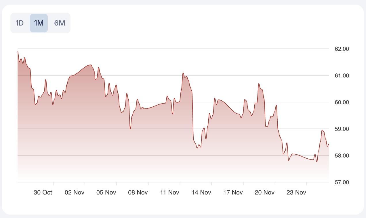 WTI Crude Oil is trading at 58.43 per barrel, near five-month lows and testing critical support in the $59–60 range. The price is below both its 50-day moving average 60.4906 and its 200-day moving average 63.98625, confirming a bearish technical structure. The prevailing micro-trend is classified as FLAT, highlighting subdued momentum and ongoing market indecision. The Relative Strength Index (RSI) is in the 28–34 range, signaling oversold conditions and the potential for a technical rebound if support is maintained, but the overall trend remains fragile.