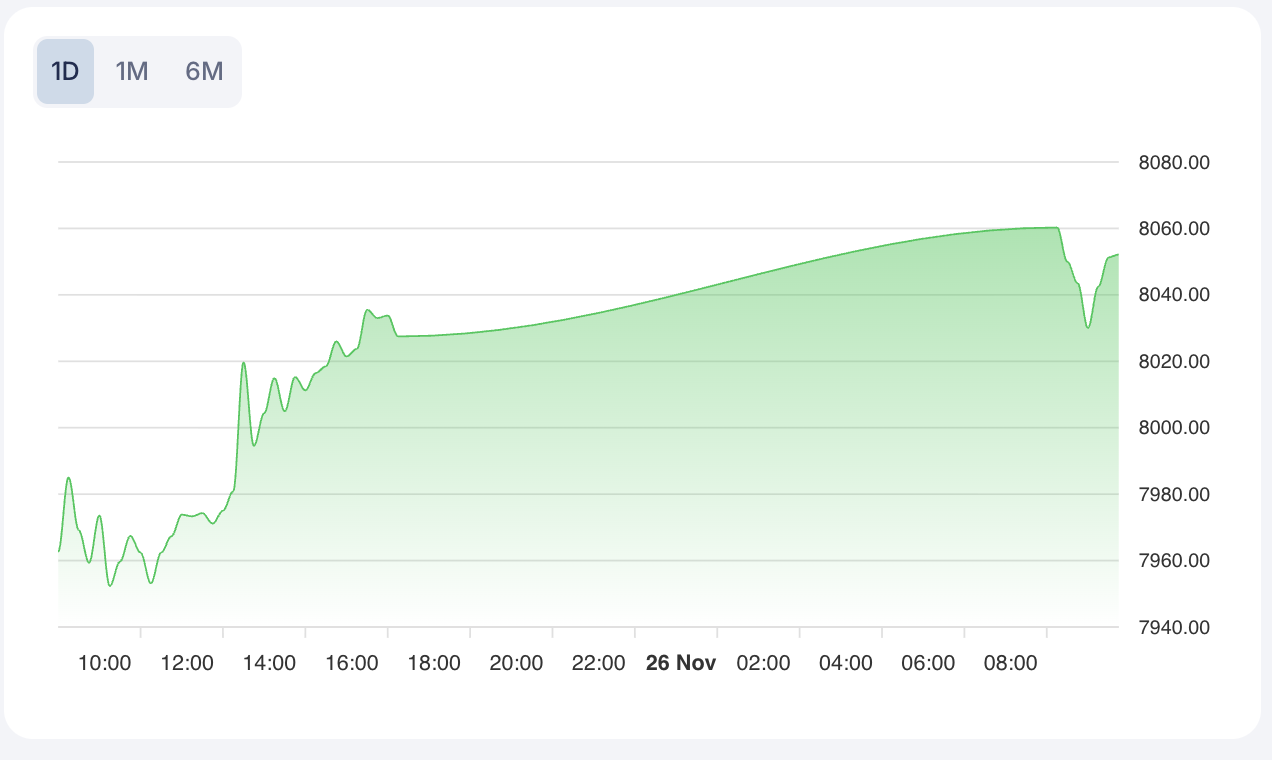 The CAC 40 (CAC 40, ^FCHI) stands at 8052.23, up by 0.33%, reflecting positive corporate earnings. The FTSE 100 (FTSE 100, ^FTSE) is at 9619.23, showing a slight increase as investors await details from the UK’s autumn budget. The IBEX 35 (IBEX 35, ^IBEX) is at 16185.2, rising 0.27%, driven by strength in the mining and healthcare sectors. The Euro STOXX 50 (Euro STOXX 50, ^STOXX50E) is at 5591.21 and also displays a STRONG_LONG micro-trend, suggesting persistent bullishness across eurozone blue chips.