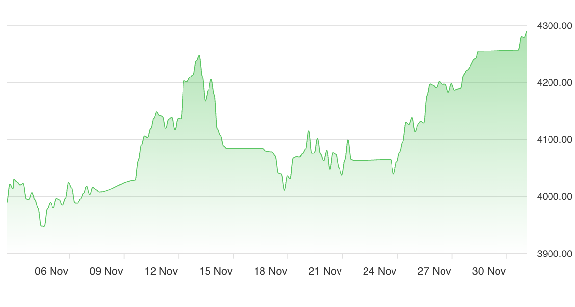 Gold is trading at 4253.135 per ounce, positioned well above its 50-day 4080.4783 and 200-day moving averages 3568.99729, indicating robust technical momentum. The RSI is near 70, signaling an overbought market. Nonetheless, the prevailing micro-trend is classified as STRONG_LONG, suggesting that short-term momentum remains upward, although the risk of intermittent consolidation is elevated following such strong gains.