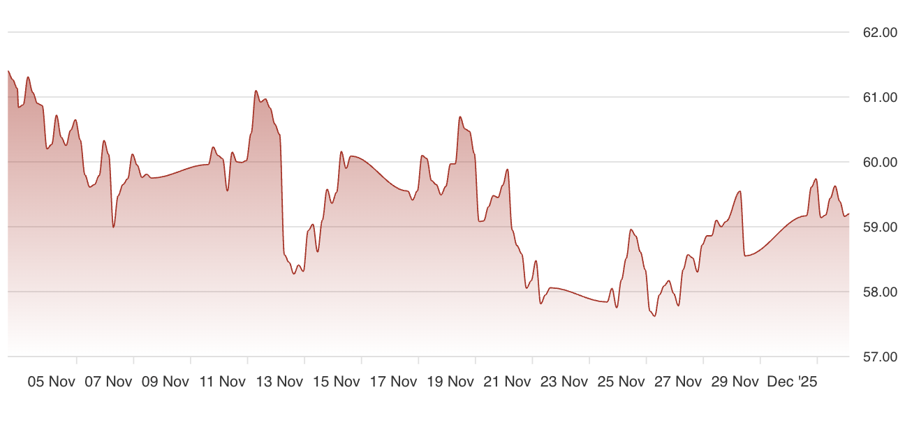 WTI crude oil is currently trading at 59.21 per barrel, hovering near multi-month lows and testing critical support levels. The price remains below both its 50-day moving average 59.8784 and 200-day moving average 63.6615, confirming a prevailing bearish technical structure. The Relative Strength Index (RSI) is in the 28–34 range, indicating oversold conditions and the potential for a technical rebound should support hold. The micro-trend is classified as FLAT, signaling subdued momentum and ongoing market indecision. This setup suggests that while downside risks persist, the technical environment is primed for a relief rally if current support levels remain intact.