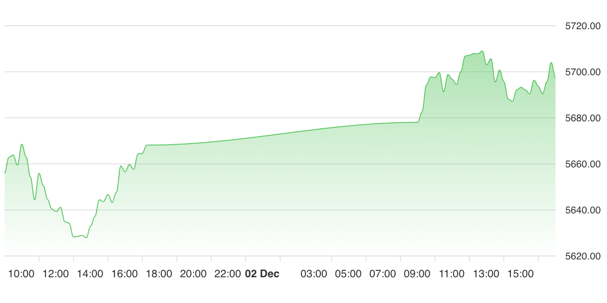 The IBEX 35 (^IBEX) is at 16483.5, up 0.57661, trading above key moving averages and maintaining positive longer-term momentum. The Euro STOXX 50 (^STOXX50E) is trading at 5695.37, with a daily gain of 0.49211 and a STRONG_LONG trend, signaling continued bullish sentiment in Eurozone blue chips.
