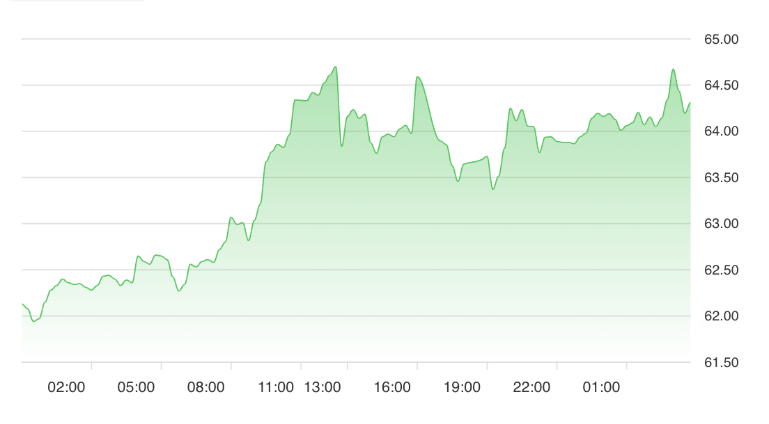 Brent Crude Oil is quoted at 63.75 per barrel. The short-term trend is moderately bullish, with the price above both its 5-day 63.79 and 10-day 63.65 averages. Support is observed at 63.59 and 63.64, while immediate resistance lies at 63.81 and 63.86. The Relative Strength Index (RSI) of 60.15 suggests moderate bullish momentum, supporting the prospect of further gains if resistance is surpassed.