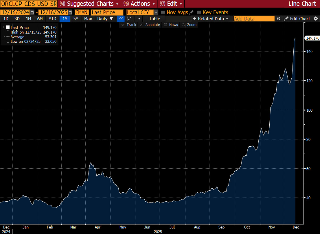 As illustrated by the chart, Credit Default Swap (CDS) spreads have risen substantially, indicating that investors are demanding higher compensation to insure against a potential Oracle default. The increase in CDS prices suggests that concerns over debt-financed AI infrastructure spending remain unresolved.