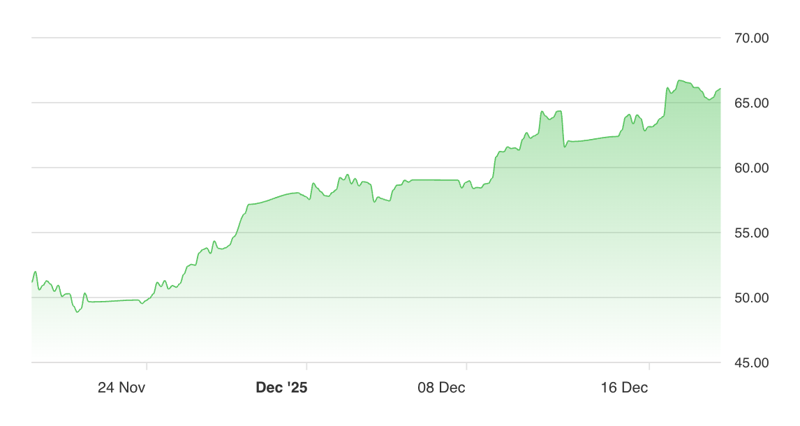 Silver (SLV, XAG/USD) is currently at 65.88 per ounce, standing significantly above its 50-day 53.51 and 200-day 42.59 averages. The technical structure is strong, and the micro-trend is flat, suggesting a likely period of consolidation after significant gains but with a constructive medium-term bias due to ongoing investor and industrial demand.