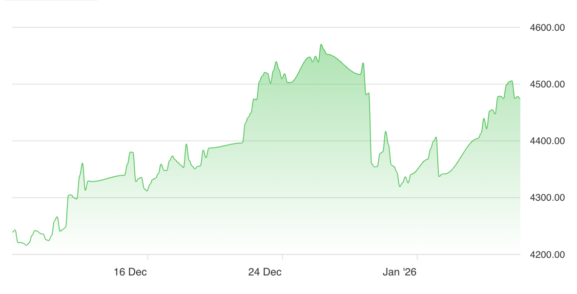 Gold is trading at $4.43K per ounce, near all-time highs and well above its 50-day $4.27K and 200-day $3.74K. The asset achieved over 50 all-time highs during 2025, returning more than 60%, driven by strong central bank demand and a weaker U.S. dollar. The RSI hovers near 70, indicating an overbought market, while the micro-trend is classified as STRONG_LONG, suggesting the short-term path of least resistance remains upward, though intermittent consolidation may occur.