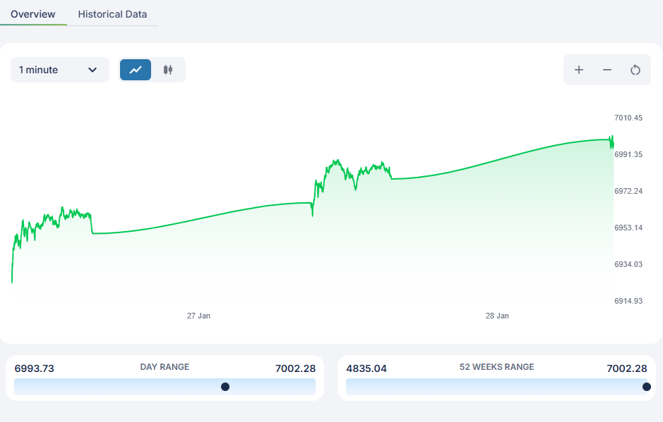 The major U.S. stock indices are showing mixed performance as of January 28, 2026. The S&P 500 (SPY) is trading at $695.49, up 0.39%, reflecting bullish momentum and marking a continuation of its record-setting rally with a recent close at 6,978.60. This upward trend signals sustained investor confidence, particularly in large-cap and growth sectors. The Nasdaq Composite (QQQ) stands at $631.13, up 0.87%, driven by ongoing strength in technology stocks, such as Apple and Microsoft, which have delivered robust earnings. In contrast, the Dow Jones Industrial Average (DIA) is at $490.06, down 0.80%, weighed by sector-specific losses, particularly among health insurers like UnitedHealth.