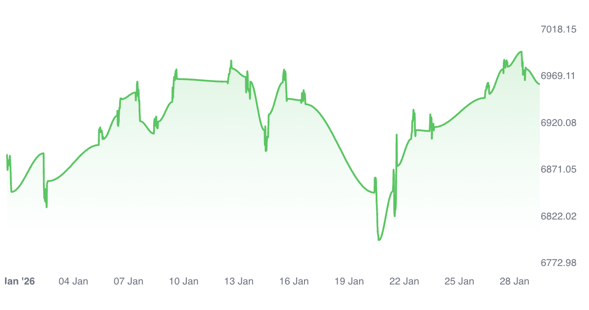 The Federal Reserve recently maintained its main interest rate, fostering stability across markets. This decision led to minimal index movement, with the S&P 500 decreasing by less than 0.1% to 6.98K, the Dow Jones edging up by 12.19 points to 49.02K, and the NASDAQ rising 0.2% to 23.86K. Gold reached a record high, reflecting increased demand for safe-haven assets amid macro uncertainty.
